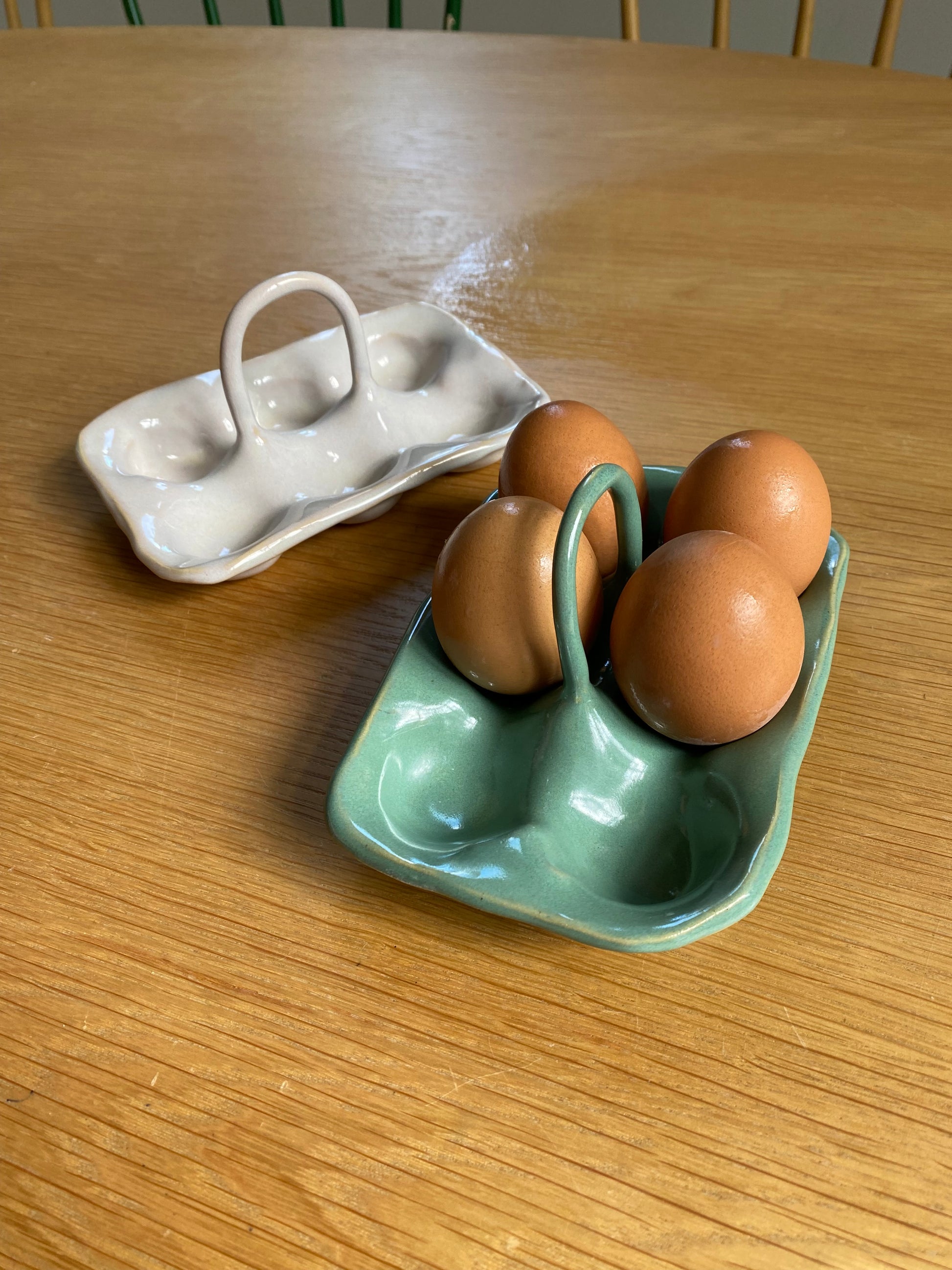 Porte-œuf, en grès blanc, façonné et émaillé à la main.