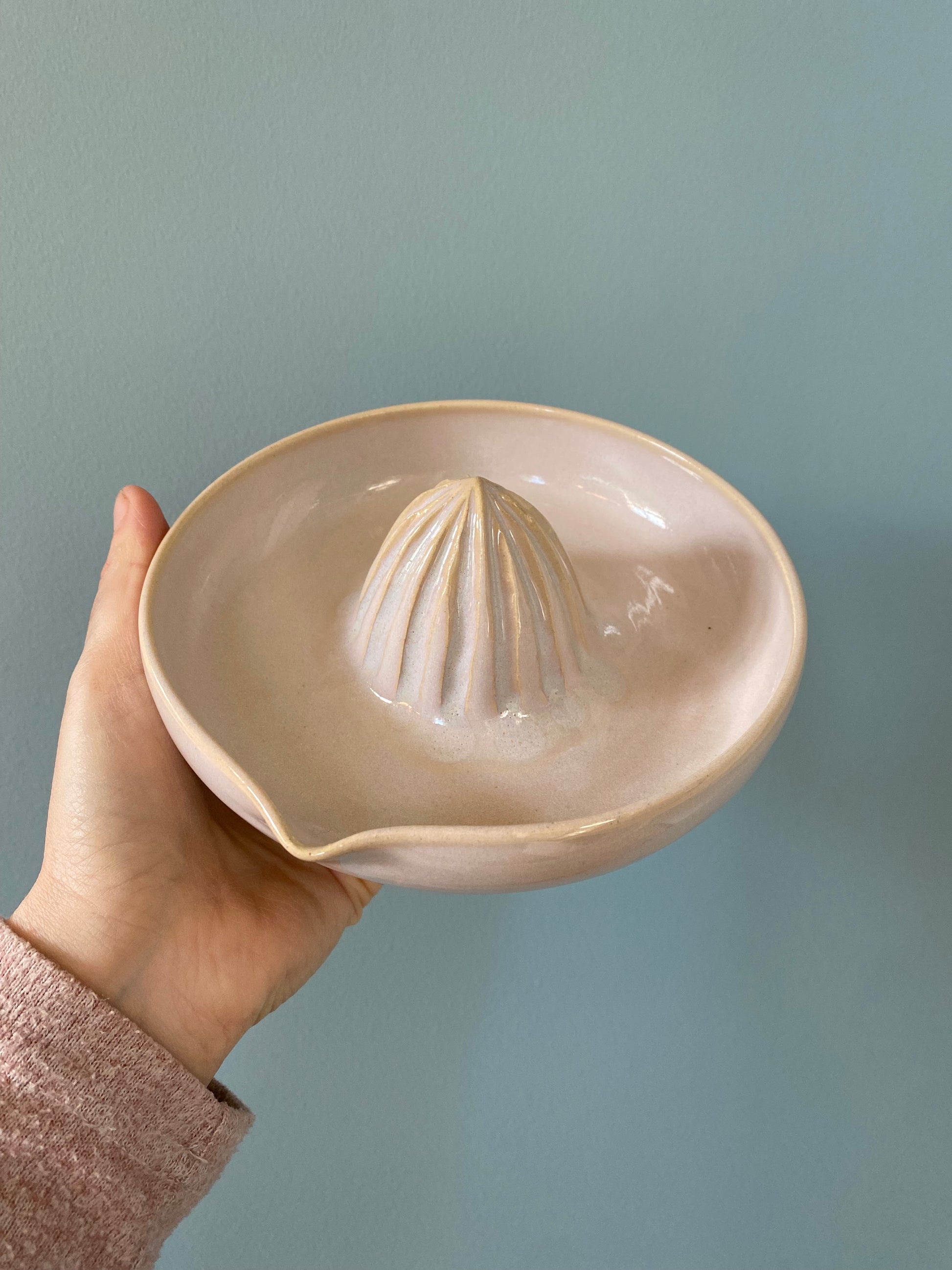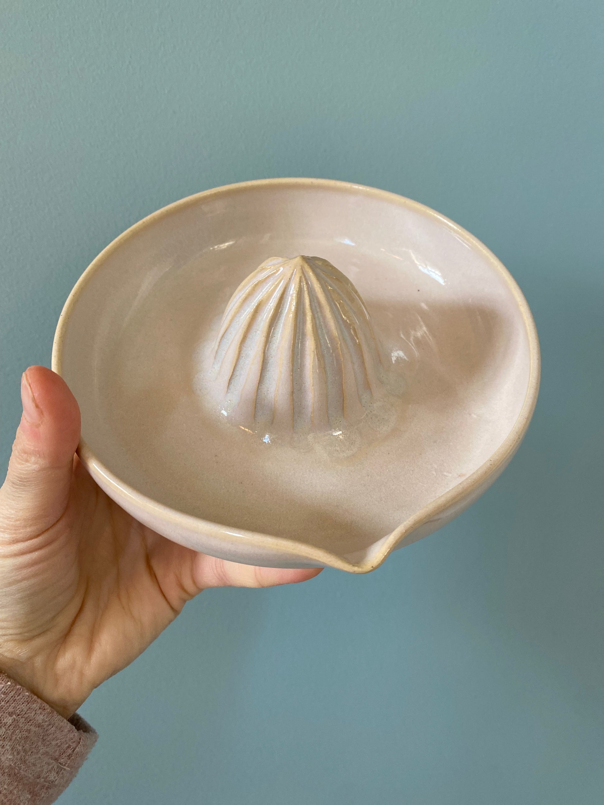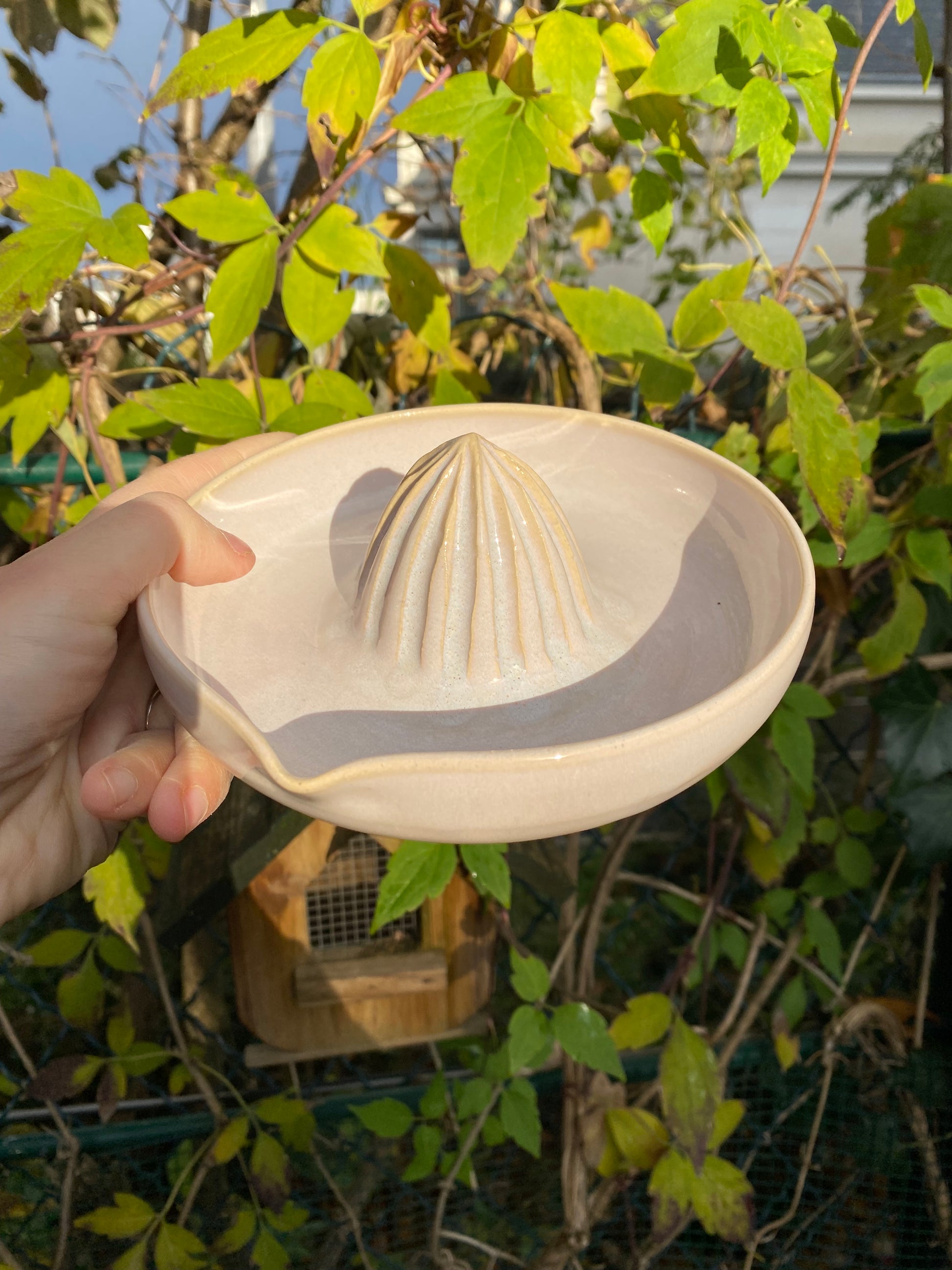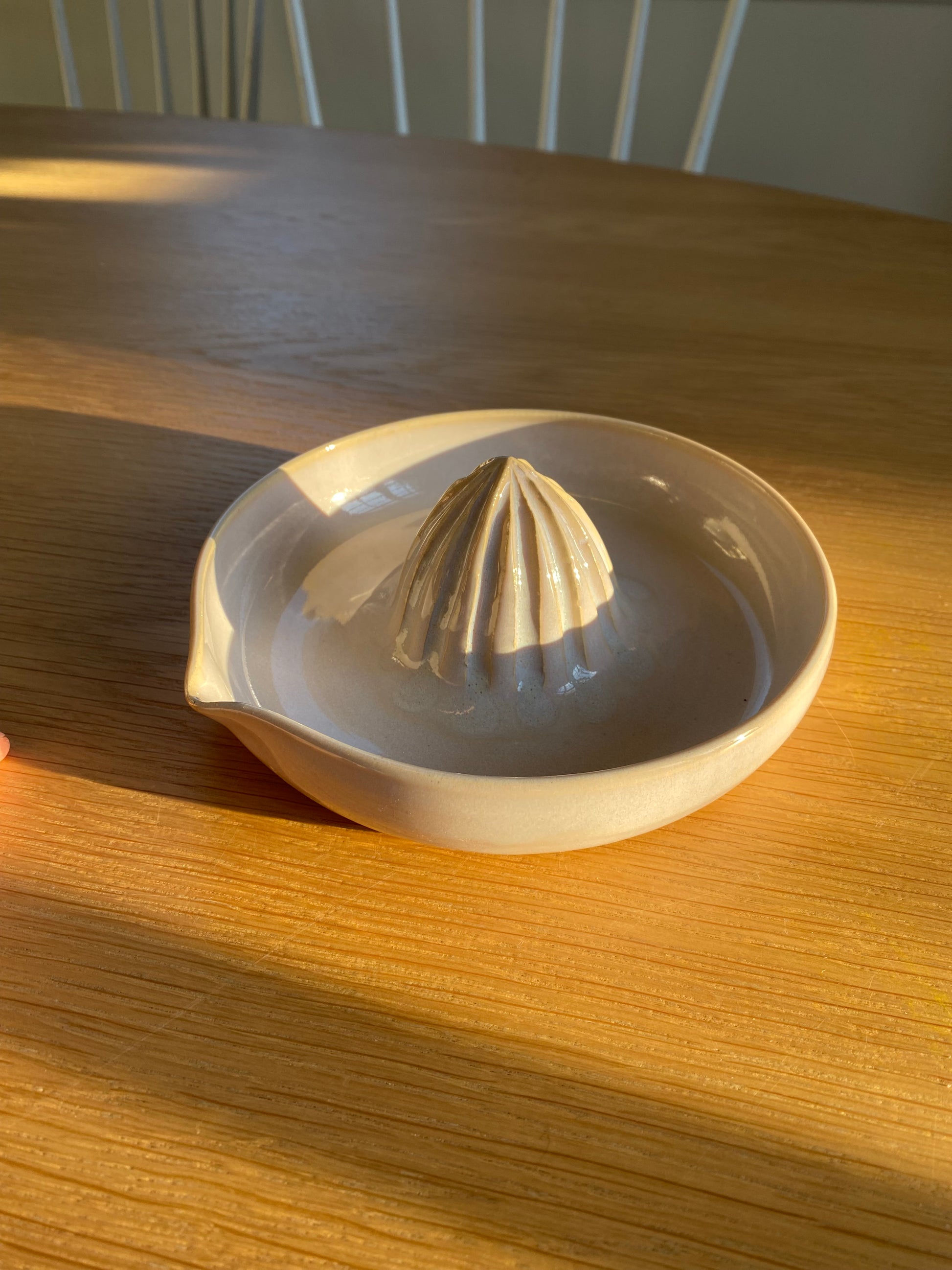 Presse-agrumes, en grès blanc, tourné et émaillé à la main.