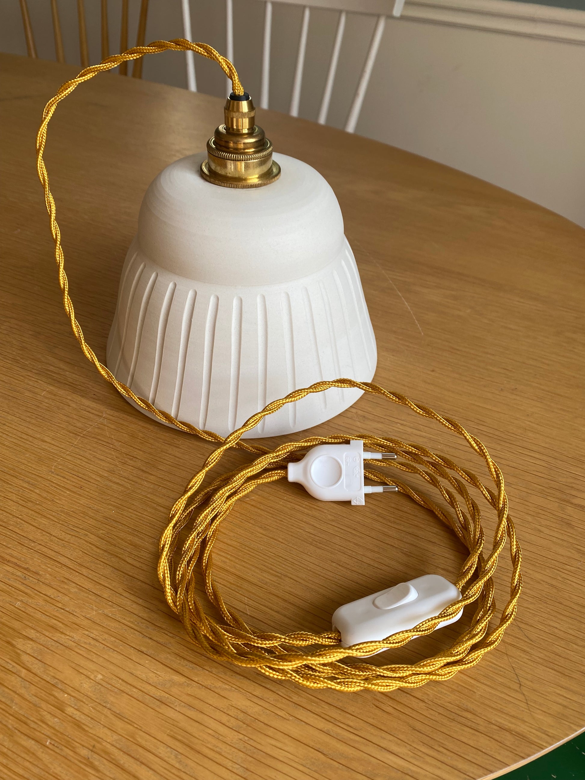 - Cable torsadé doré d'environ 2m et douille en laiton assemblés et fournis (avec ou sans interrupteur/prise, au choix)